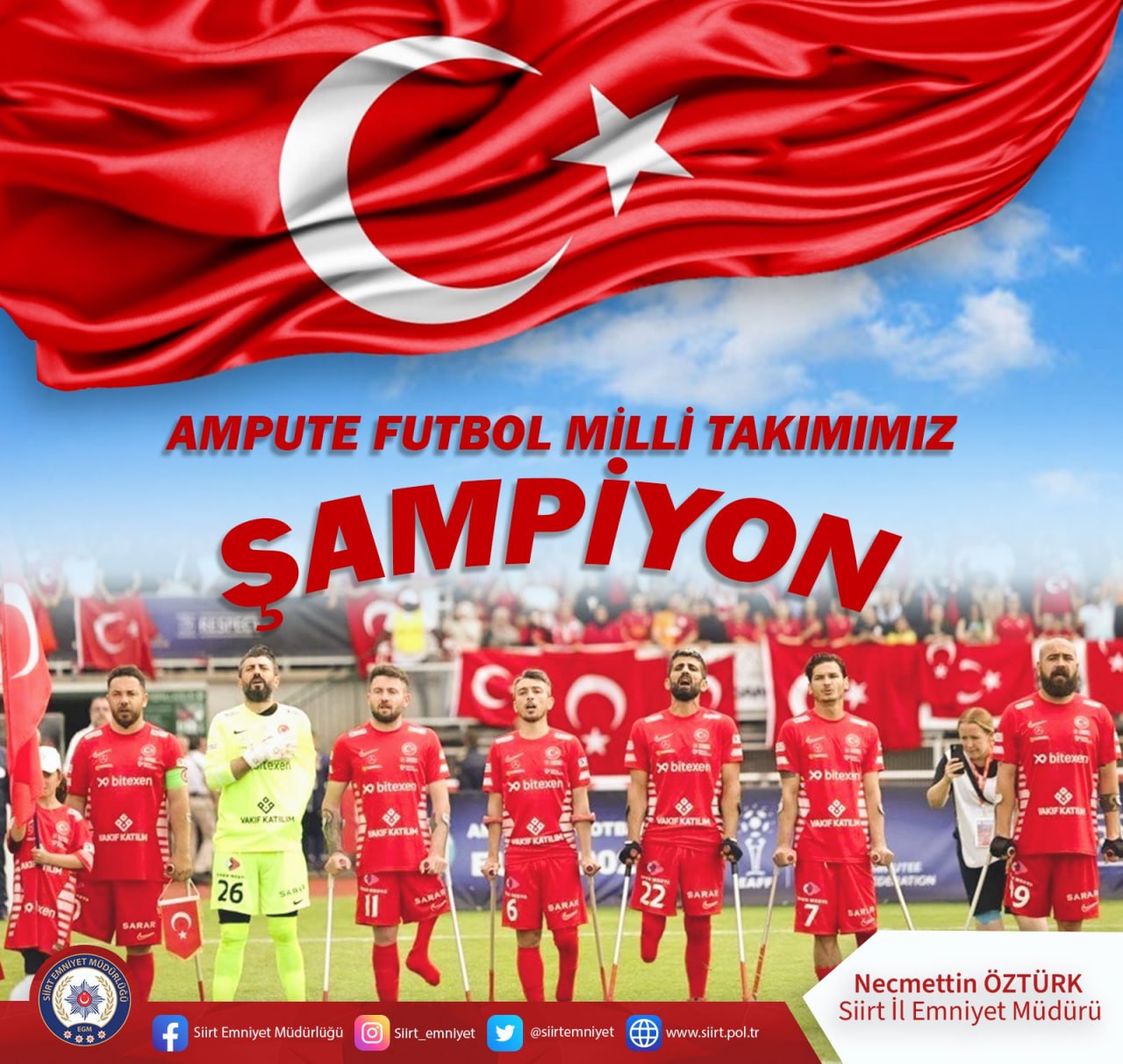 Ampute Futbol Türkiye Milli Takımı üst üste üçüncü kez Avrupa şampiyonu oldu. Siirt Valiliği de tebrik mesajı yayınladı.